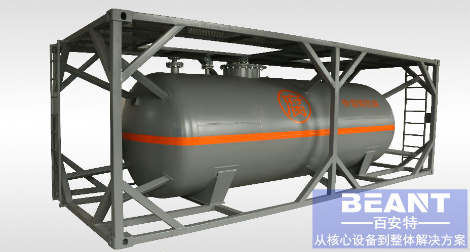 用于裝運酒類、油類、液體食品、化學藥品等液體貨物的集裝箱。主要由液罐和框架構成。液罐為橢圓形或近似球形,采用雙層結構。內壁采用不銹鋼;或用其他剛性材料制成,但需涂布一層環氧樹脂,防止液體貨物的腐蝕。外壁采用保溫材料。一般罐頂有圓形的裝貨口,罐底有卸貨閥。有高壓液罐、低壓液罐、保溫液罐、帶加熱裝置液罐等數種。框架采用高強度鋼材制成,液罐放在框架中間。罐式集裝箱的搬運操作、裝貨、卸貨、貯藏均需一定專門場所,并配備專門的消防安全設備。